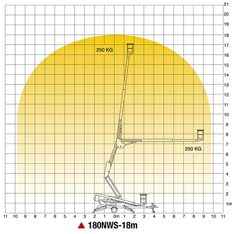 La nacelle élévatrice 180 WH est une machine très compacte, pratique et sûre. Avec une longueur de transport de 7,2 m et une hauteur de travail de 18 m, elle peut offrir une portée latérale de 10 m. Un grand avantage de cette nacelle est que vous restez complètement à l’intérieur des pieds de soutien lors de la rotation de la nacelle, ce qui évite toute gêne pour les véhicules circulant dans la rue.